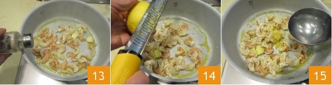 Ajustez le sel et le poivre 13, râpez environ la moitié du zeste restant du citron que vous aviez utilisé pour le pesto 14 et ajoutez une louche d'eau de cuisson des pâtes 15, puis éteignez le feu.