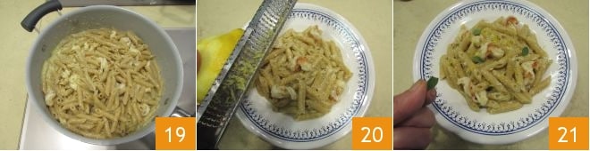 Mélangez pour bien amalgamer les pâtes à la sauce 19, toujours hors du feu, en ajoutant si nécessaire une autre louche d'eau de cuisson des pâtes. Transférez les pâtes ainsi assaisonnées sur le plat de service, ajoutez le reste du zeste de citron râpé 20 et quelques feuilles de marjolaine 21 : vos penne au pesto d'amandes et crevettes sont prêtes à être servies bien chaudes !