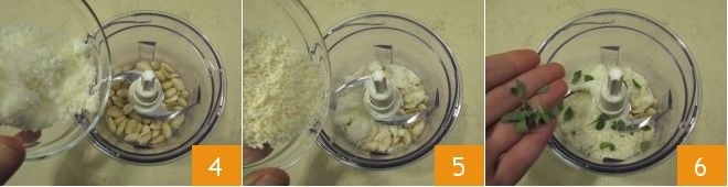 Une fois toutes les crevettes nettoyées, mettez une casserole d'eau sur le feu pour cuire les pâtes et passez à la préparation du pesto d'amandes : versez les amandes pelées dans un mixeur, ajoutez le Grana râpé 4, le pecorino râpé 5, les feuilles de marjolaine 6,