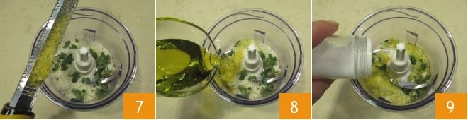 le zeste râpé d'un demi-citron (faites attention à ne prendre que la partie jaune) 7, l'huile d'olive extra vierge 8, du sel 9 et du poivre,