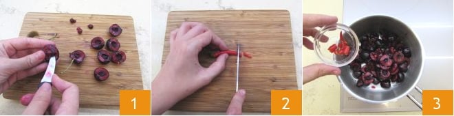 Pour préparer les pêches farcies de robiola avec sauce aux cerises épicée, commencez par préparer la sauce. Lavez les cerises, retirez le noyau et la tige, et coupez-les en deux 1. Coupez également le piment frais en morceaux 2 et placez-le avec tous ses pépins dans une casserole, avec les cerises 3.