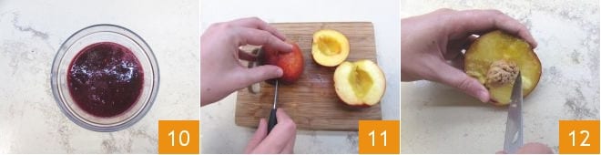 et placez-la au réfrigérateur pour qu'elle refroidisse pendant au moins deux heures 10. Vous pouvez préparer la sauce quelques jours à l'avance et la conserver au réfrigérateur dans un récipient hermétique. Ensuite, passez aux pêches : coupez-les en deux le long du noyau 11 et retirez le noyau 12.
