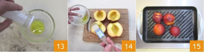 Dans un petit bol, mélangez l'huile et le sel 13, trempez-y un pinceau de cuisine et badigeonnez l'émulsion sur la partie coupée des pêches 14. Chauffez une plaque, et quand elle est bien chaude, grillez les pêches côté coupé 15, pendant 3-4 minutes.