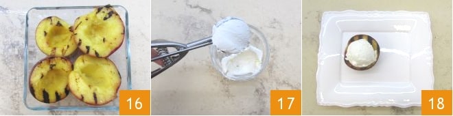 Quand les pêches sont prêtes, mettez-les de côté 16. Dans un petit bol, mettez la robiola bien froide du réfrigérateur et écrasez-la un peu avec une cuillère pour la rendre crémeuse. Avec une cuillère à glace, prélevez une boule de robiola 17 et remplissez-en une moitié de pêche, que vous aurez placée dans une petite assiette à dessert 18.