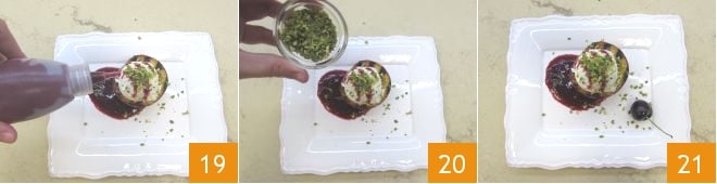 Prenez la sauce aux cerises, mettez-la dans un biberon de cuisine pour faciliter l'opération et versez-en environ un quart dans l'assiette 19. Saupoudrez enfin d'un quart des éclats de pistaches 20 et complétez le plat avec une cerise entière 21. Procédez de la même manière avec les autres portions : vos pêches farcies sont prêtes à être dégustées !