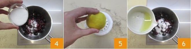 Ajoutez également le sucre 4, pressez le citron 5 et ajoutez le jus dans la casserole 6.