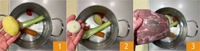 Pour préparer le picchiapò, versez dans une marmite pleine d'eau froide les légumes épluchés : la carotte, la branche de céleri, les tomates et la pomme de terre 1. Épluchez l'oignon et ajoutez-en la moitié 2, puis ajoutez aussi la viande de bœuf 3.