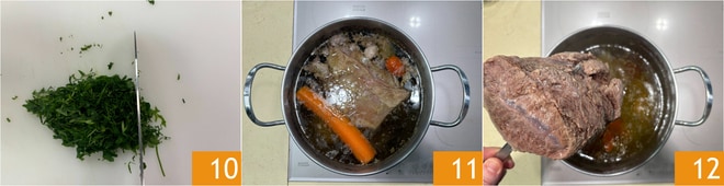 Entre-temps, lavez et hachez le persil frais 10. Après le temps de cuisson 11, égouttez le bouilli 12.