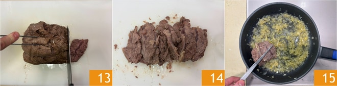 Coupez la viande 13 pour obtenir des tranches fines, mais pas trop 14. Une fois que l'oignon sera bien étuvé, disposez dessus les tranches de bouilli 15.