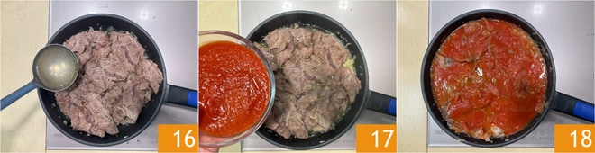 Ajoutez une louche de bouillon de viande 16 et la purée de tomates 17, mélangez et faites cuire environ 10 minutes 18, ou le temps nécessaire pour que la sauce se réduise.