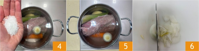 Assaisonnez avec du gros sel 4, allumez le feu et laissez bouillir pendant 2 heures 5. Entre-temps, épluchez et hachez 3 oignons blancs 6.