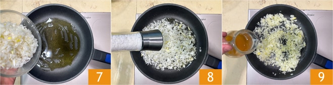 Dans une poêle, chauffez l'huile d'olive, puis ajoutez le hachis d'oignons 7, salez 8, ajoutez une louche du bouillon de viande en cuisson 9 et faites suer les oignons à feu doux.