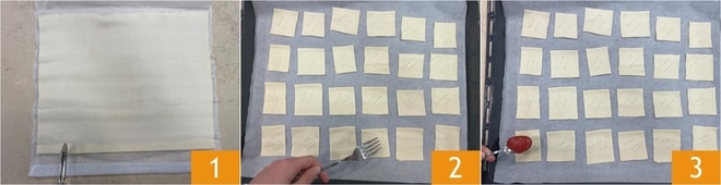 Pour réaliser les pizzettes carrées de pâte feuilletée, étalez le rouleau de pâte feuilletée et découpez-le en carrés d'environ 3x3 cm avec une roulette lisse 1 : vous obtiendrez 24 pièces. Transférez les carrés sur une plaque recouverte de papier sulfurisé et formez 4 rangées de 6. Piquez les feuilletés avec une fourchette 2 et assaisonnez les deux premières rangées avec la sauce tomate 3.