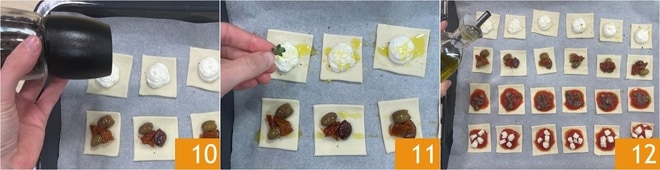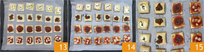 Faites cuire dans un four statique préchauffé à 200° pendant 20 minutes 13. Lorsqu'elles sont dorées, sortez les pizzettes du four 14 et garnissez celles aux olives avec quelques feuilles de marjolaine et celles à la mozzarella avec un peu plus d'origan. Laissez tiédir et servez vos pizzettes carrées de pâte feuilletée 15 !