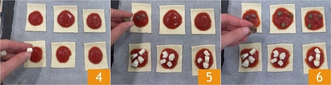 Ajoutez sur les feuilletés de la première rangée des dés de mozzarella 4 et une pincée d'origan. Ensuite, garnissez les feuilletés de la deuxième rangée avec des câpres 5 et un petit morceau d'anchois 6.