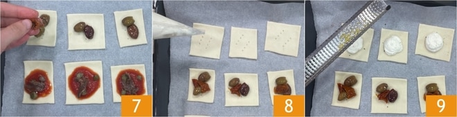 Assaisonnez chaque feuilleté de la troisième rangée avec 2 olives et une demi-tomate séchée 7. Pour finir, ajoutez une petite cuillerée de fromage à tartiner sur les feuilletés de la quatrième rangée 8 et râpez-y un zeste de citron 9.