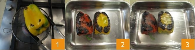 Pour réaliser les poivrons farcis à la napolitaine, commencez par rôtir les poivrons sur la flamme des brûleurs avec une grille à flamme pendant au moins 10 minutes chacun, en les retournant de temps en temps 1. Si vous ne disposez pas de grille à flamme, vous pouvez rôtir les poivrons dans une poêle très chaude. Placez les poivrons dans un plat 2, couvrez-les de film plastique 3 et laissez-les ainsi avant de les peler, pendant au moins 15 minutes.