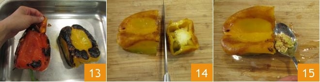 Ensuite, récupérez vos poivrons et enlevez la peau extérieure qui se détachera facilement de cette manière 13. Coupez le chapeau supérieur 14 et retirez les graines internes 15.