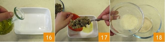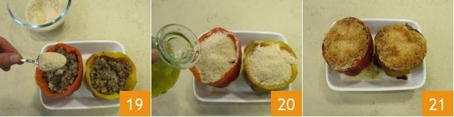 Maintenant, huilez un plat allant au four 16, déposez les poivrons et farcissez-les avec la garniture que vous avez préparée précédemment 17. Dans un bol, mélangez le parmesan râpé avec la chapelure 18
