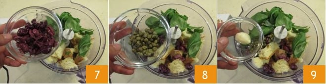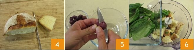 En attendant, occupez-vous de la garniture : coupez le pain en tranches 4, réduisez-le en cubes et dénoyautez les olives de Gaeta avec un outil approprié ou un couteau 5. Dans le bol du mixeur, mettez le pain, les feuilles de basilic et le persil 6,