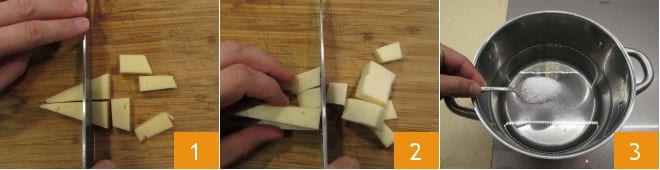 Pour réaliser la polenta concia, commencez par couper la fontina 1 et la toma en dés 2. Ensuite, placez sur le feu une casserole en acier à fond épais, versez l'eau et chauffez-la; lorsqu'elle commence à frémir, ajoutez le sel 3,