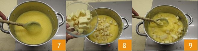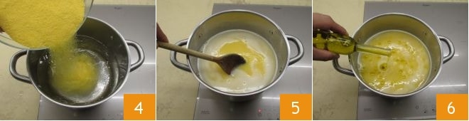 versez la farine en pluie tout en remuant avec une cuillère en bois 4, maintenez la cuisson à haute température en mélangeant rapidement 5. Ajoutez également l'huile d'olive qui servira à éviter la formation de grumeaux 6, poursuivez la cuisson pendant 50 minutes à feu doux sans arrêter de mélanger, en veillant à ne pas laisser la polenta coller au fond.