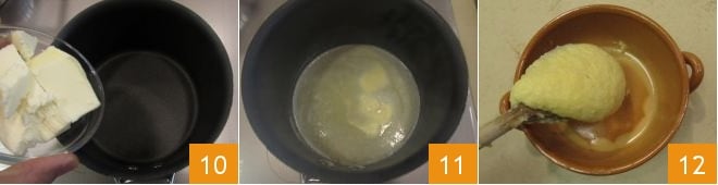 Entre-temps, placez le beurre dans une casserole 10 et faites-le fondre à feu doux 11. Lorsque la polenta est prête et que les fromages à l'intérieur sont bien fondus, versez-la dans des petits plats en terre cuite 12 qui permettront de garder le plat chaud.