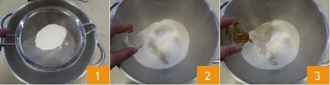 Pour préparer la puccia salentine, commencez par tamiser la farine dans le bol du robot pâtissier 1, puis ajoutez-y également la levure déshydratée 2 et le malt 3.