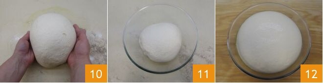Toujours avec les mains, essayez de lui donner une forme sphérique 10, puis placez-la dans un bol assez grand huilé avec un filet d'huile 11. Couvrez avec du film plastique et laissez lever dans le four éteint mais avec la lumière allumée pendant environ 2-3 heures (la température indiquée est de 28-30°C), jusqu'à ce qu'elle ait doublé de volume 12.