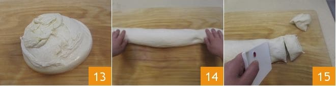 Transférez la pâte sur une planche à pâtisserie 13 et, en la travaillant avec les mains, essayez d'obtenir un rouleau 14. Découpez 18 portions d'environ 90 g chacune, en vous aidant d'une corne 15 ou de la lame d'un couteau.