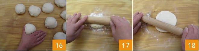 Prenez chaque morceau de pâte et, en le tenant dans la main, effectuez un mouvement rotatif pour obtenir des sphères 16. Étalez vos boules de pâte avec un rouleau à pâtisserie sur une planche à pâtisserie légèrement farinée 17, jusqu'à obtenir des disques 18 d'environ 20 cm de diamètre.