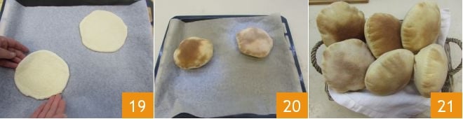 Placez-les délicatement sur une plaque recouverte de papier sulfurisé 19 et enfournez à 250°C dans un four statique préchauffé pendant environ 15 minutes (si vous utilisez un four ventilé, faites cuire à 230°C pendant environ 10 minutes). Une fois le temps écoulé, sortez vos pucce du four 20 et servez-les encore chaudes 21.
