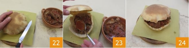 Parmi les diverses possibilités de garnir votre puccia, nous chez Giallo Zafferano avons choisi de vous proposer celle avec le Ragoût de cheval. Coupez sans appuyer à moitié votre puccia 22, remplissez-la avec le ragoût préparé 23 et servez-la encore chaude!