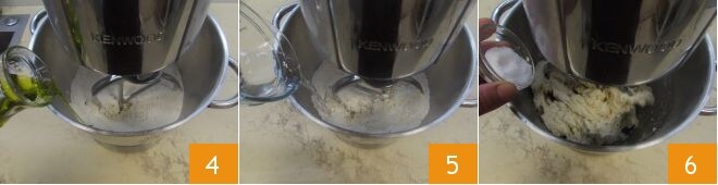 Mettez en marche le robot pâtissier avec la feuille et versez l'huile en filet 4 ; ajoutez également l'eau tiède en filet 5 et travaillez le tout pendant quelques minutes. Lorsque le mélange deviendra une masse unique, ajoutez également le sel 6.