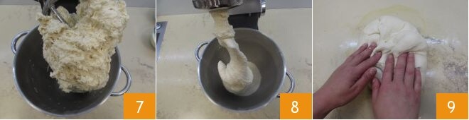 Travaillez encore pendant quelques minutes, le temps nécessaire pour que la pâte absorbe le sel 7, puis remplacez la feuille par le crochet. Remettez en marche le robot pâtissier à vitesse moyenne pendant environ 10-15 minutes, jusqu'à obtenir une pâte très lisse et élastique. Lorsque la pâte sera bien lissée 8, mettez-la sur un plan de travail huilé et travaillez-la légèrement avec les mains 9.