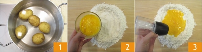 Pour réaliser les raviolis de pommes de terre et saucisse, commencez par faire cuire les pommes de terre pendant environ 30-40 minutes, selon leur taille 1. Pendant ce temps, préparez la pâte fraîche : versez la farine sur un plan de travail et formez un puits, puis cassez les œufs au centre 2 et ajoutez une pincée de sel 3.