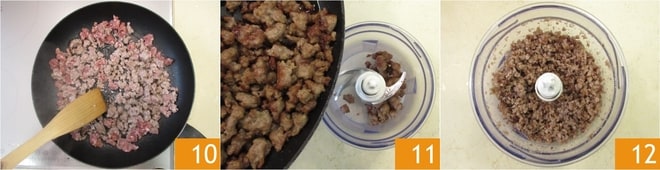 Faites revenir la saucisse pendant quelques minutes, en l'effritant en mélangeant 10. Une fois cuite, transférez-la dans un mixeur 11 pour la réduire en grains plus fins 12.