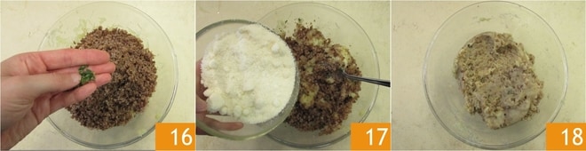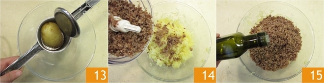 À ce stade, les pommes de terre seront cuites, écrasez-les donc dans un bol avec un presse-purée 13. Ajoutez la saucisse mixée 14 et assaisonnez avec l'huile d'olive extra vierge 15, le sel et le poivre.