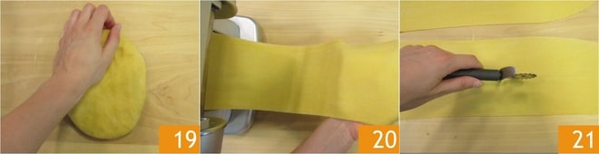 Reprenez la pâte fraîche, découpez un premier morceau (conservez le reste dans du film alimentaire), étalez-le avec les mains 19, puis utilisez une machine à pâtes pour obtenir une feuille d'environ 1 mm d'épaisseur, saupoudrant d'une pincée de farine 20. Divisez les feuilles en deux dans le sens de la longueur 21.
