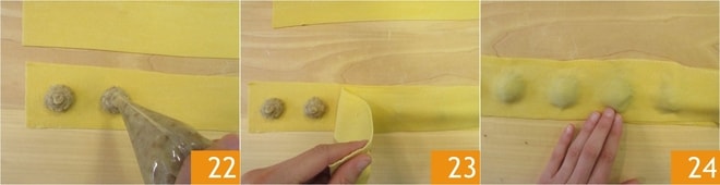 Pressez sur l'une des 2 moitiés des petits tas de farce d'environ 15-20 g chacun, en les espaçant de quelques cm 22. Recouvrez avec le second morceau de pâte 23 et pressez délicatement avec les doigts pour les faire adhérer, en veillant à faire sortir l'air de l'intérieur 24.