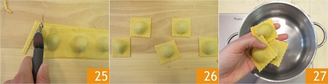 Enfin, découpez les bords avec une roulette dentelée 25 de manière à obtenir des raviolis carrés d'environ 5 cm 26. Procédez de la même manière jusqu'à ce que la pâte fraîche soit épuisée. Une fois tous les raviolis prêts, faites-les cuire dans de l'eau bouillante légèrement salée 27.
