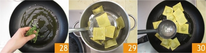 Entre-temps, reprenez la poêle dans laquelle vous avez fait revenir la saucisse et faites infuser un filet d'huile d'olive extra vierge avec quelques brins de thym 28. Égouttez les raviolis 29 et transférez-les dans la poêle avec une louche de l'eau de cuisson 30.