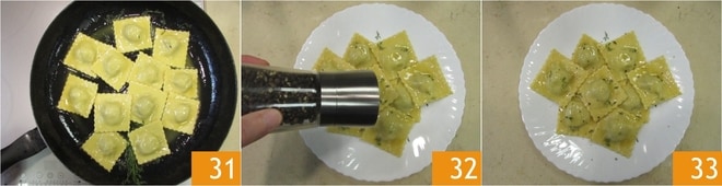 Faites sauter pour amalgamer les raviolis à l'assaisonnement 31. Complétez les assiettes avec des petites feuilles de thym et un tour de moulin à poivre 32. Les raviolis de pommes de terre et saucisse sont prêts à être servis 33 !