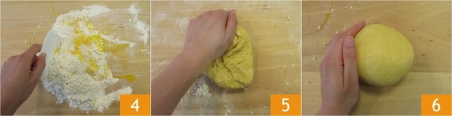 Commencez à mélanger le mélange, en récupérant la farine peu à peu, en vous aidant également d'une corne 4. Continuez à travailler à la main sur le plan de travail 5, pendant au moins 10 minutes. Vous devez obtenir une pâte lisse et homogène 6. Enveloppez la pâte dans du film alimentaire et laissez reposer dans un endroit frais et sec, pendant au moins 30 minutes.
