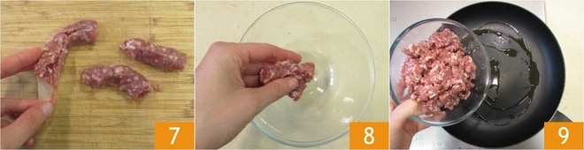 Passez à la préparation de la farce : retirez l'enveloppe de la saucisse 7 et émiettez-la avec les mains 8. Faites chauffer un filet d'huile d'olive extra vierge dans une poêle antiadhésive et ajoutez la saucisse 9.