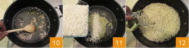 Versez un filet d'huile dans une autre casserole, ajoutez l'échalote 10 et laissez-la fondre à feu doux. Ajoutez le riz 11 et faites-le griller pendant 2-3 minutes en augmentant légèrement le feu. Déglacez avec le vin blanc 12.