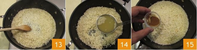 et laissez évaporer complètement, en continuant à remuer 13. Continuez la cuisson du risotto en ajoutant un peu de bouillon de crevettes 14. À ce stade, il est préférable de remuer le risotto le moins possible et d'ajouter le bouillon quelques louches à la fois, seulement si nécessaire et toujours bien chaud. Après environ 13 minutes, ou jusqu'à ce qu'il soit al dente, ajoutez la poudre de réglisse 15