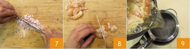 Entre-temps, hachez finement l'échalote 7 et coupez les crevettes en morceaux 8. Ensuite, filtrez le bouillon et gardez-le au chaud 9.