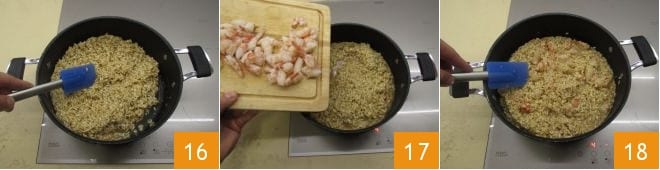 et mélangez 16 Ajoutez également les morceaux de crevettes 17 et mélangez à nouveau 18.