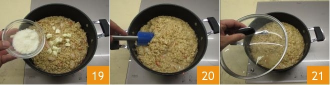 Attendez environ 3 minutes puis éteignez le feu ; ajoutez ensuite : beurre, pecorino 19 et amalgamez-les avec le reste pour crémer le risotto 20. Couvrez avec un couvercle 21 et attendez encore quelques minutes.